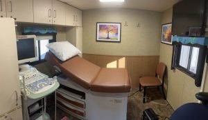 The 35-plus-foot RV mobile ultrasound clinics are fully outfitted with a reception area and small couch, examination table, bathroom, and space for an ultrasound machine.