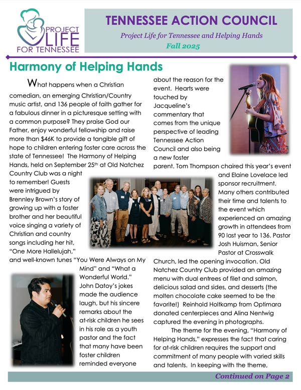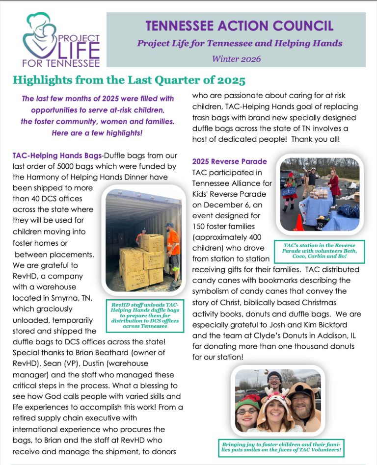 Tennessee Action Council: Ministry for At-Risk Children is a 501c3 nonprofit organization, partnering with pregnancy centers, and is comprised of two divisions: Helping Hands and Project Life, both focused on children and families. Jacquelin McDonald, Tennessee Action Council Board President, comments: “Being involved with this ministry, knowing my efforts are truly helping women in need, saving the lives of innocent